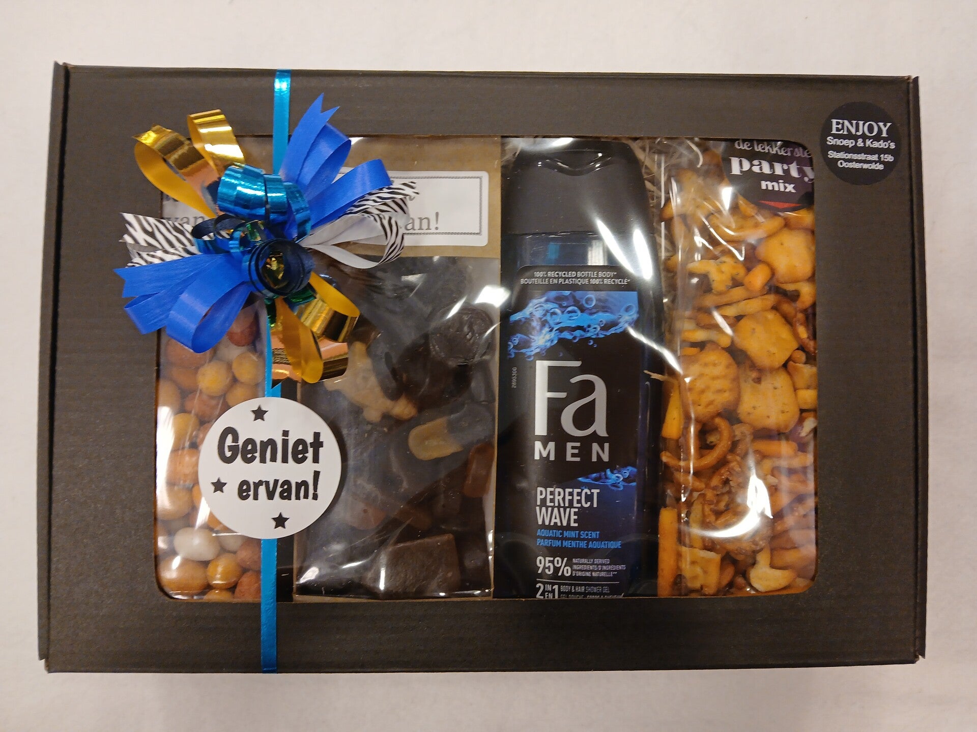 Inhoud: borrelnootjes, dropjes, Fa douchegel, partymix zoutjes