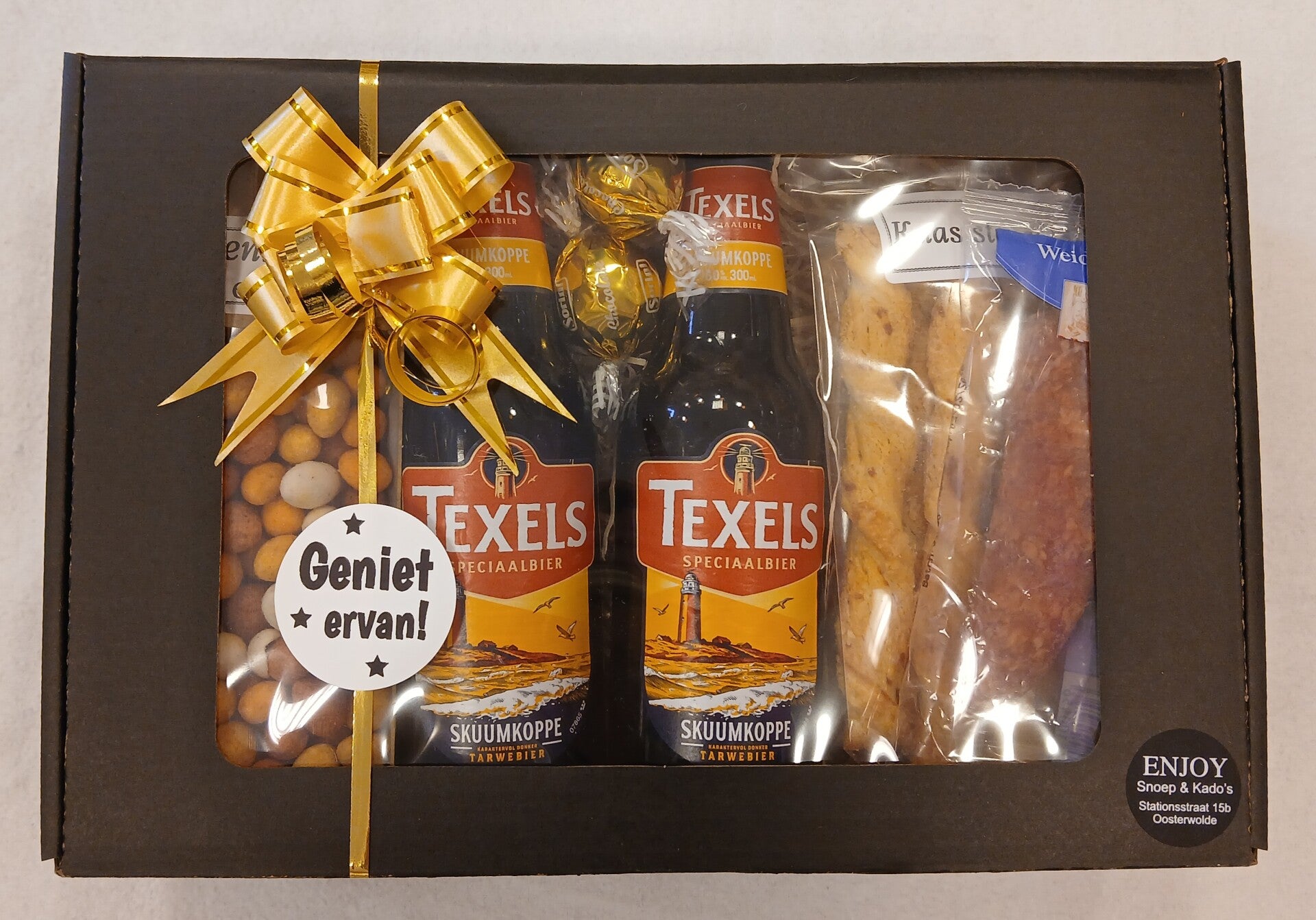 2 flesjes Texels bier, borrelnootjes, kaasstengels, droge worst, melkchocolade