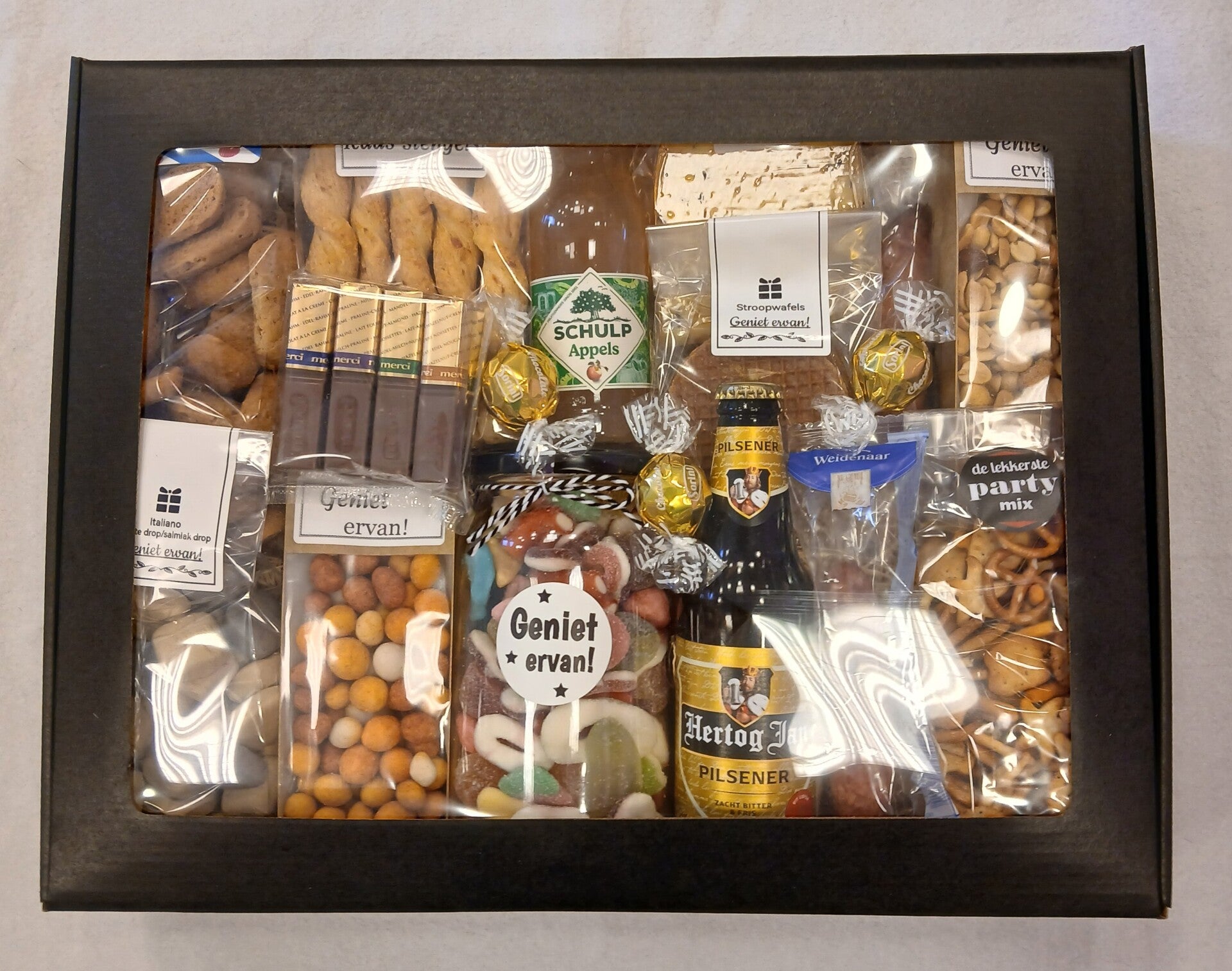 Kruidenkaas, fryske dumkes koekjes, kaasstengels, merci chocolade, 3 chocolade ballen, hertog Jan biertje, Schulp appelsap, stroopwafels, Italiano zachte drop/salmiak drop, borrelnootjes, partymix zoutjes, zoute pindamix, snoeppot (1 liter inhoud), 2 x weidenaar droge worst